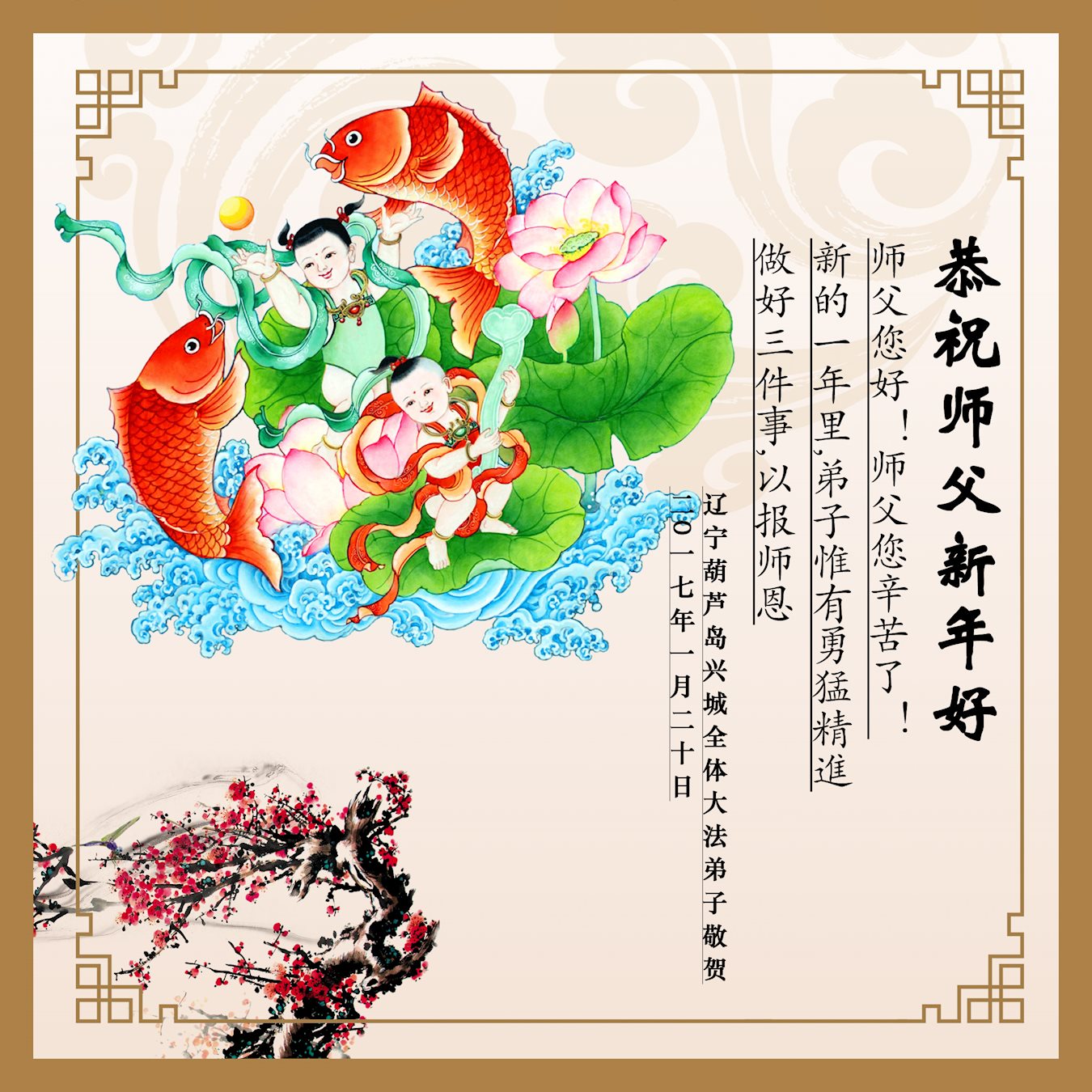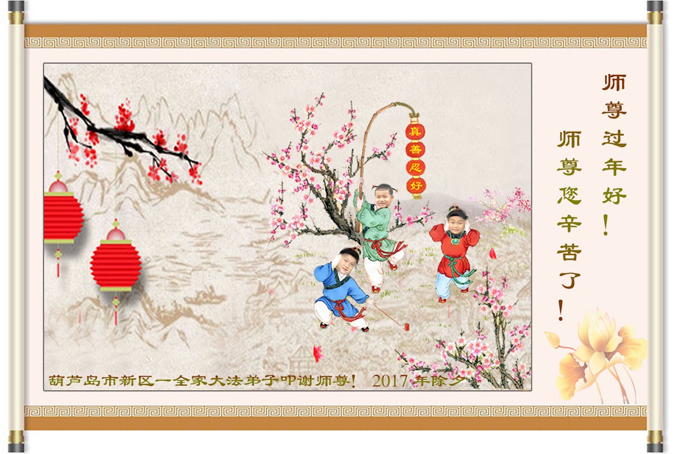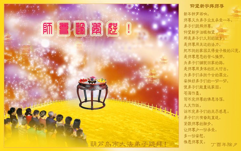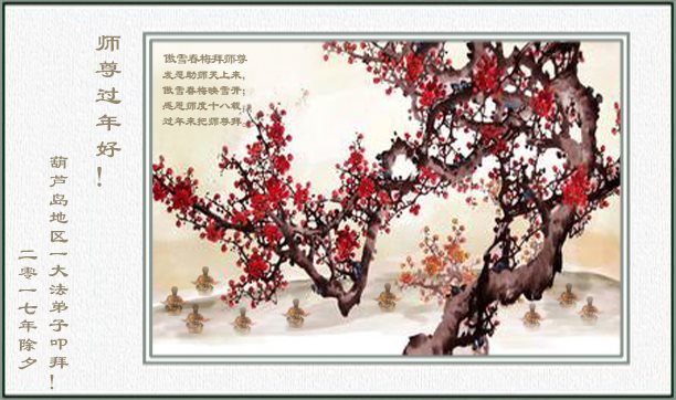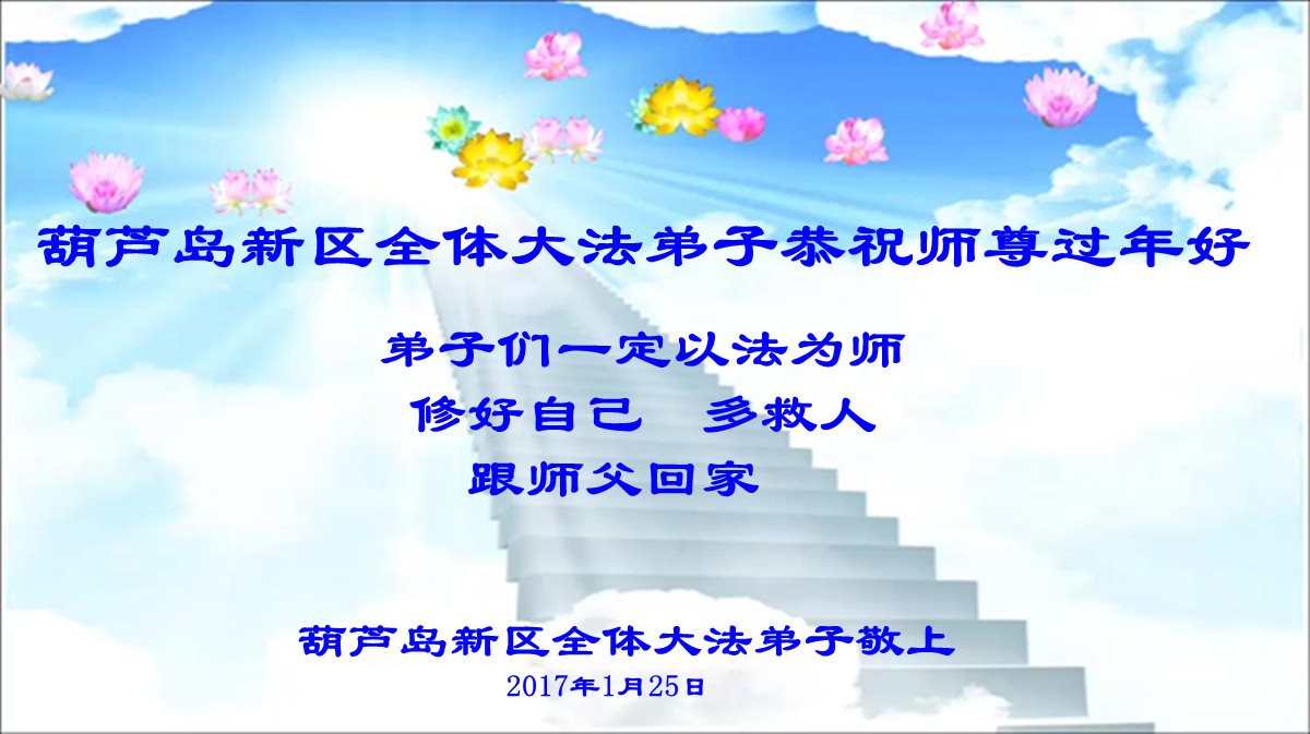 師尊過年好!師父新年快樂!葫蘆島地區全體大法弟子給師父拜年!浩蕩洪恩中迎來了2017年。風雨兼程中,一路走過來,全是師尊慈悲呵護。這其中,溶灌著慈悲師尊的多少艱辛?您用最大的一切為宇宙蒼穹眾生、為弟子們付出著,承受著……。您用您那無量的慈悲,使一個個眾生得救;並給了所有弟子們第二次生命!感恩師尊!師尊您辛苦了!謝謝師父!我們會珍惜這來之不易的神聖萬古機緣,在師尊所賜與的這段寶貴時間裏,我們一定要學好法,時時以法為師,事事用法對照,去掉各種人心和執著,修煉中不斷的向內找,修好一思一念,修好自己,不斷提高心性與昇華。發好正念,清除破壞大法與危害眾生的一切邪惡。慈悲挽救眾生,講好真相喚醒更多世人。助師正法中正念正行,精進不停。弟子們決不辜負師父希望,不負來世使命,證實法救眾生中兌現神聖誓約。以回報師尊慈悲救度之恩!謝謝師父!葫蘆島地區全體大法弟子合十敬拜!