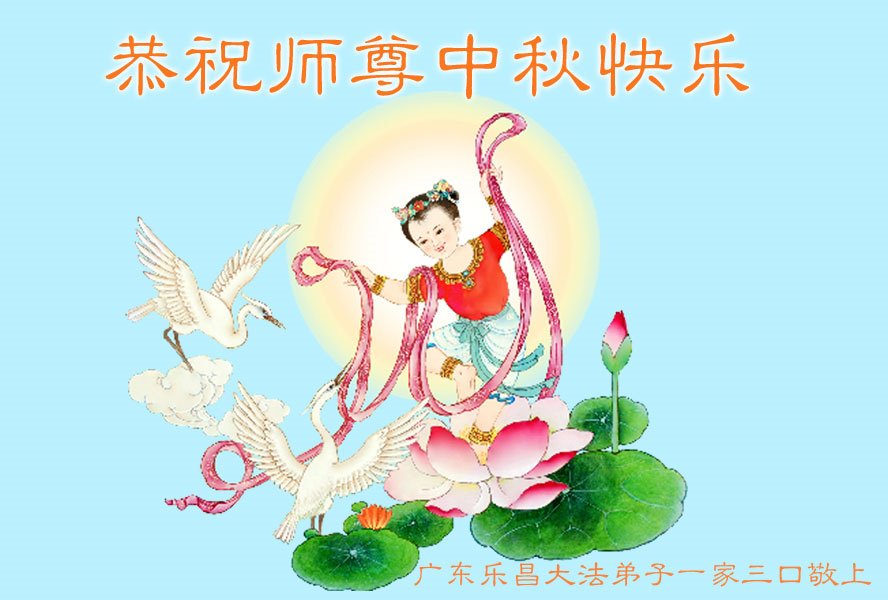 廣東省韶關市樂昌市大法弟子一家三口恭祝師尊中秋快樂!