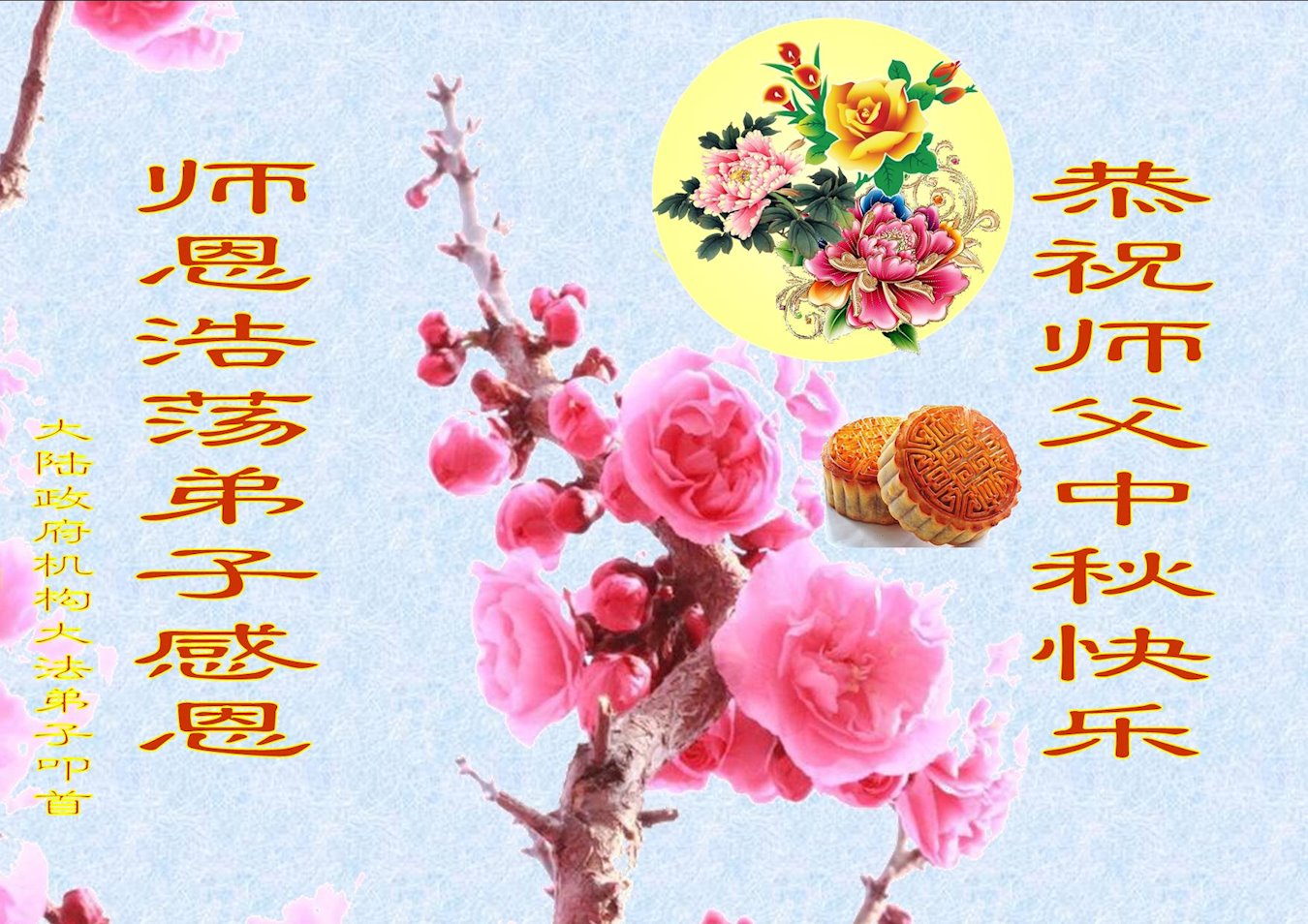中秋佳節快到了,弟子感恩師尊二十年的慈悲救度,在這些年的摔摔打中,讓弟子認識到修煉真的是嚴肅,只有不折不扣的真修、實修自己,徹底放下人心、妄念,才能走好萬古機緣的正法路,救度那些急盼得救的無量眾生,才能圓滿回家。師父辛苦了!