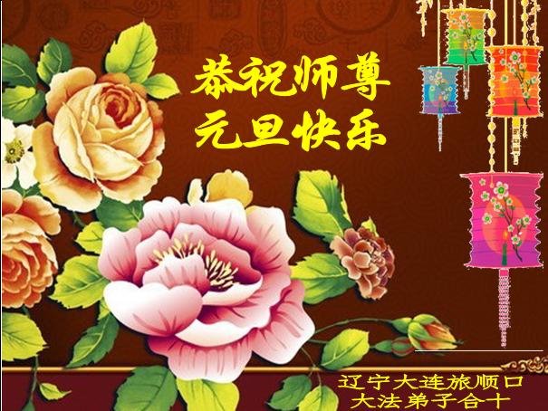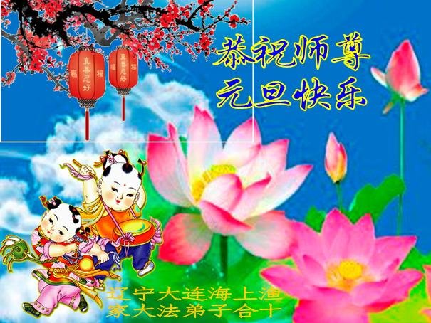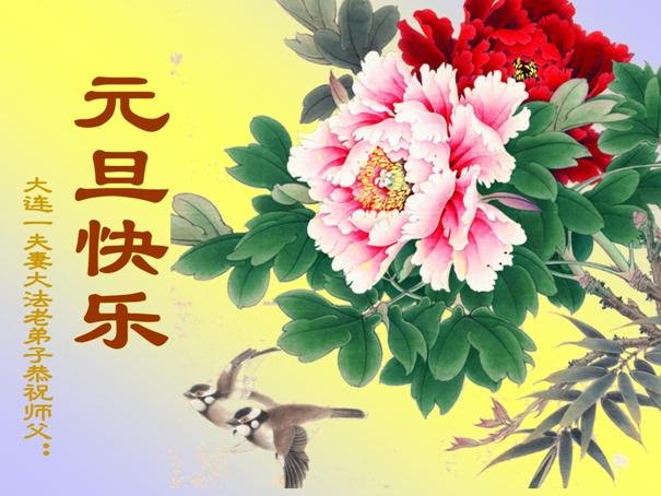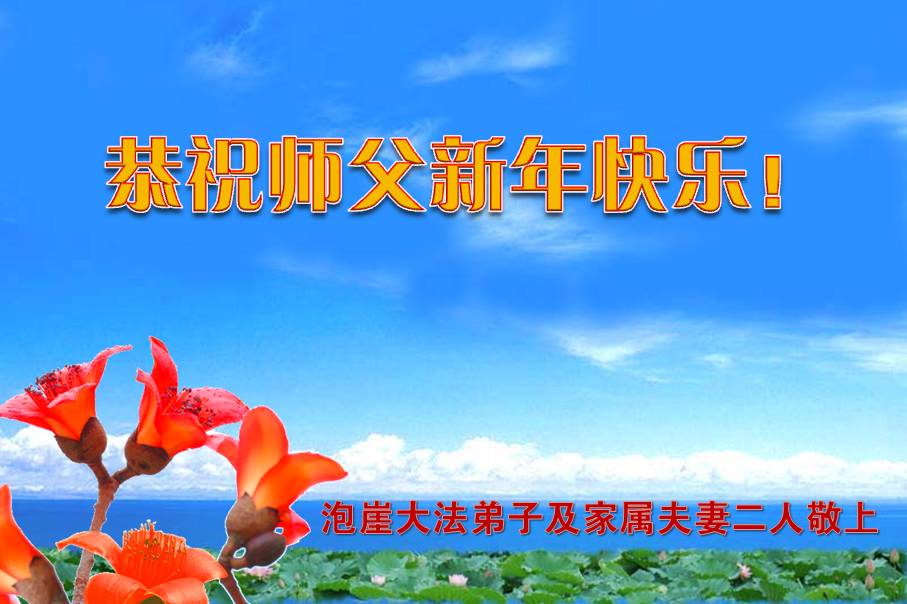 大連市泡崖大法弟子及家屬夫妻二人恭祝師父新年快樂!