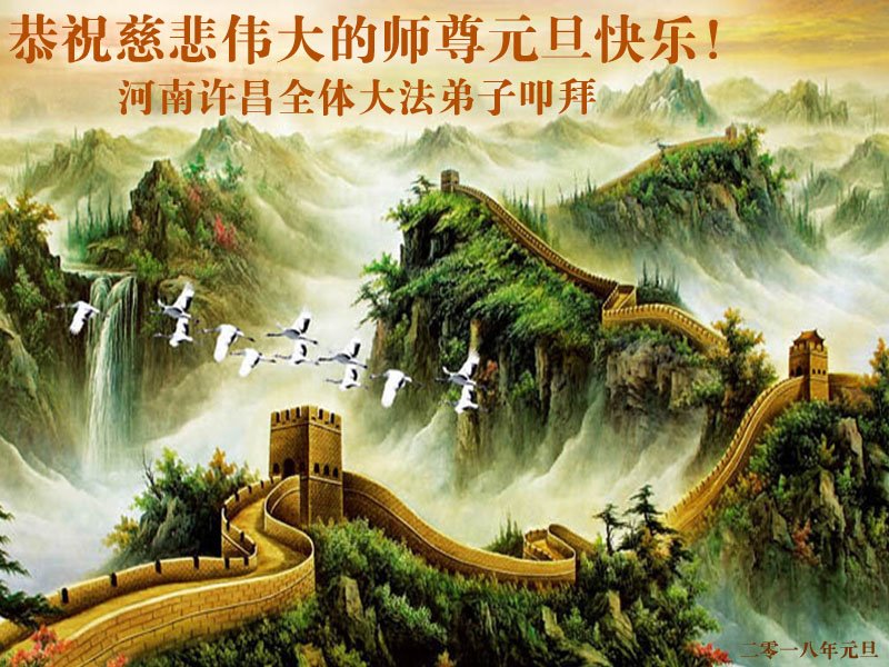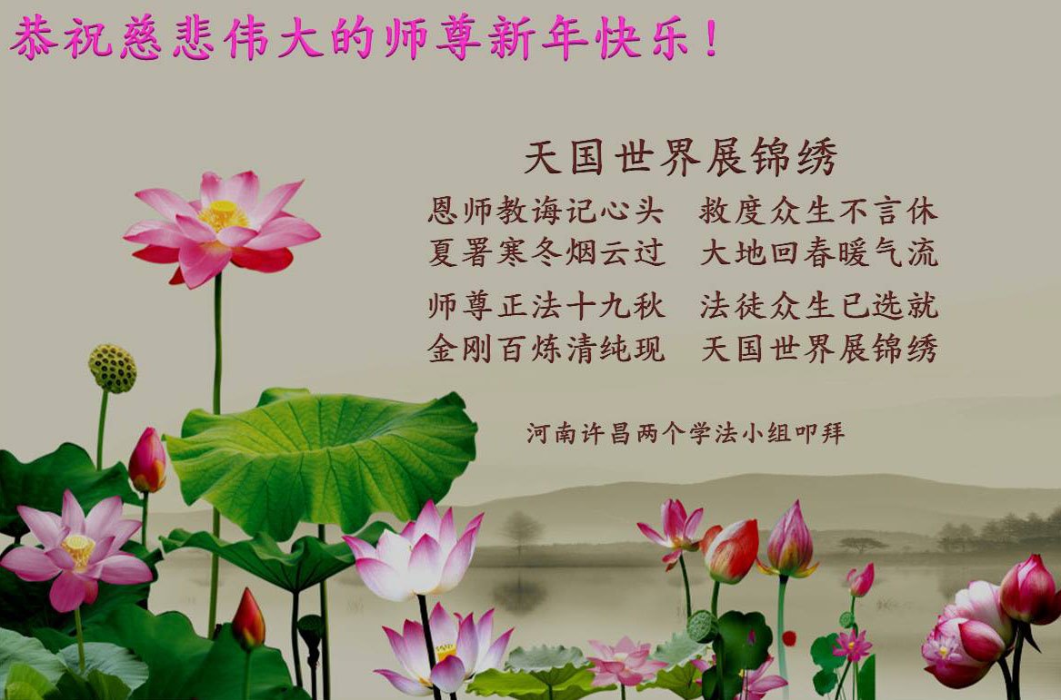 新年就要到了,我們許昌三個學法小組的大法弟子向師尊問好!在這新的一年裏,弟子牢記師尊教誨,多救人、多救人,珍惜這萬古機緣,珍惜這最後不多的時間,修好自己,用洪大的慈悲救度一切可救度的眾生。弟子叩拜師尊!