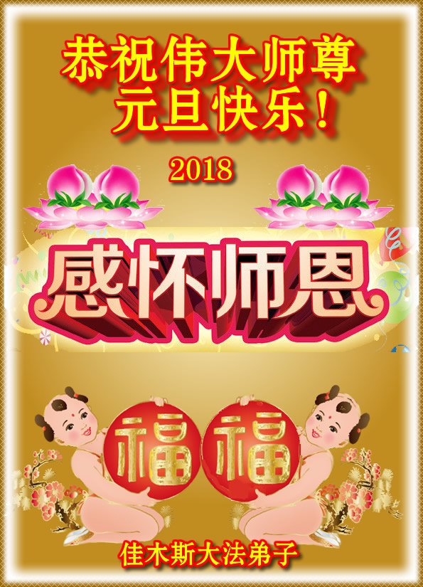 值此二零一八年元且之際,我們小組全體大法弟子及家屬向慈悲偉大的師尊、李洪志大師祝賀元旦快樂!我們決心整體配合好,在正法最後修煉路上勇孟精進,兌現來世助師正法,救度眾生的史前大願!謝謝師尊!