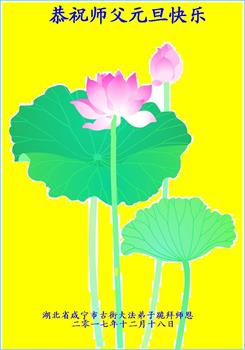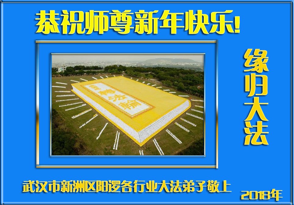 請允許我代表湖北省直屬機關的大法弟子及家屬祝師尊新年快樂!不平凡的2017年即將過去,我們能順利度過,都是師尊的慈悲保護。