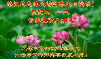 河北保定大法弟子攜女兒、外孫恭祝慈悲的師父生日快樂!法輪大法好!真善忍好!