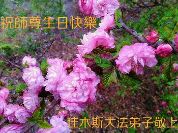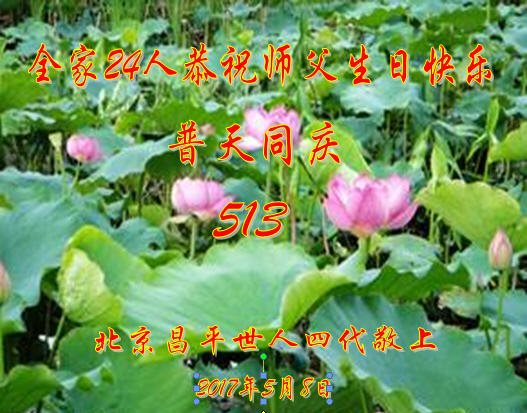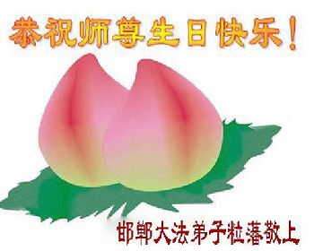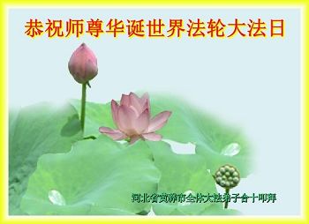 師尊您好!我們修煉都已經二十多年了,在師尊和大法蒙冤、被誣陷時,我們都曾以身護法,捍衛宇宙真理。值此法輪大法洪傳二十五週年之際,我們懷著無比崇敬的心情恭祝師尊生日快樂!我們定抓緊時間做好三件事,多救人。請師尊放心,我們一定兌現誓約,不辱歷史使命!全體弟子叩拜師尊!合十