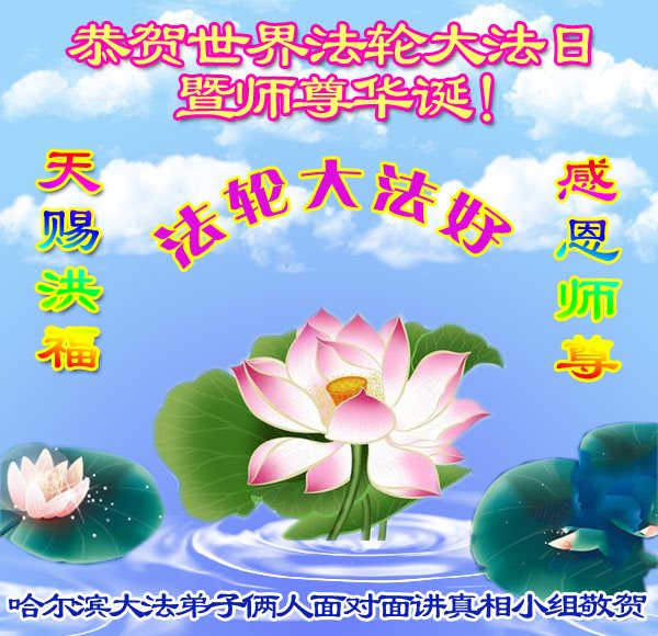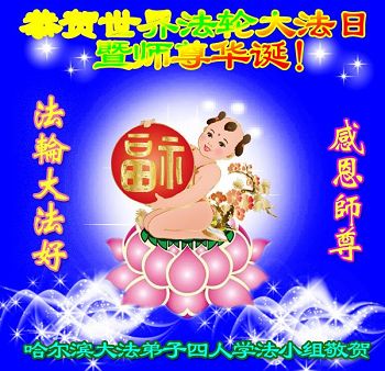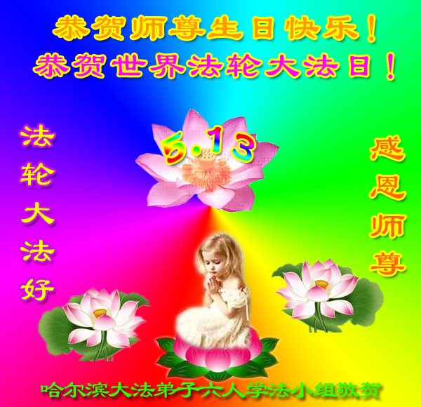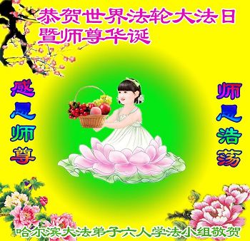 在法輪大法日到來之際,我們代表學法小組及家人恭祝師父生日快樂!