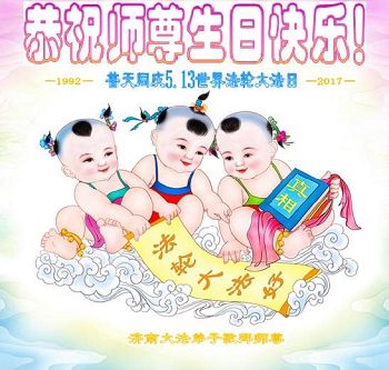 在今後的日子,我們一定學好法,多救人,以報師恩。以上是同修祝賀師父生日快樂!的賀詞,和祝賀世界法輪大法日的賀詞。