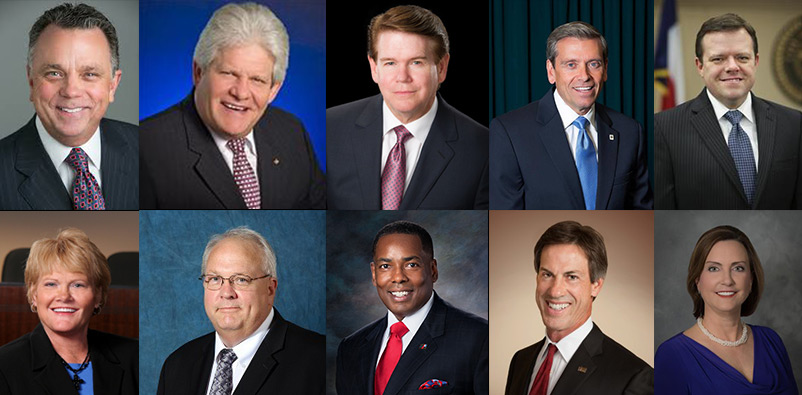 圖1:宣布法輪大法日的十個城市市長(從左到右):艾迪遜市長Todd Meier、艾倫市長Stephen Terrell、阿靈頓市長W.Jeff.Williams、伯德福特市長Jim Griffin、伯俐遜市長Ken Shetter、海蘭村市長Charlotte Wilcos、路易斯維爾市長Rudy Durham、布蘭諾市長Harry Larosiliere、珀若斯坡市長Ray Smith和南湖市長Laura Hill。 |