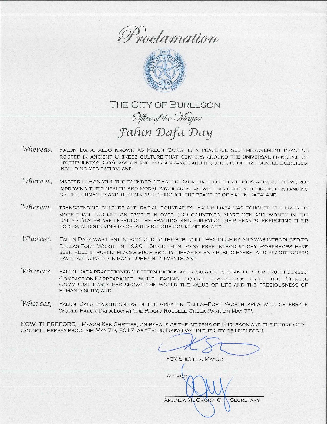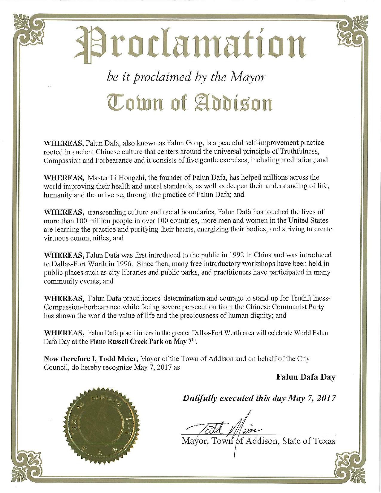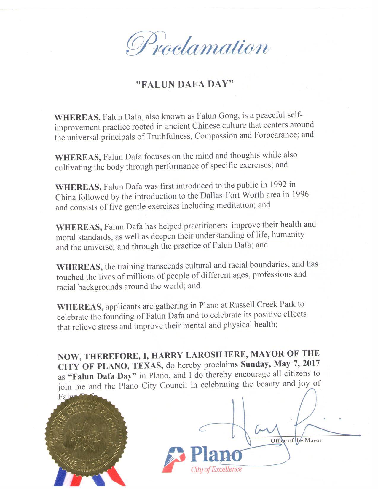 【明慧網二零一七年五月十二日】(明慧記者曾洪美國達拉斯報導)美國德克薩斯州達拉斯地區法輪功學員於二零一七年五月七日在布蘭諾(City of Plano)Russell Creek公園慶祝法輪大法洪傳世界二十五週年暨第十八世界法輪大法日,達拉斯-沃斯堡地區十個城市的市長給美南法輪大法學會發來褒獎令,宣布「法輪大法日」,盛讚法輪大法的真、善、忍理念及對社區的貢獻。