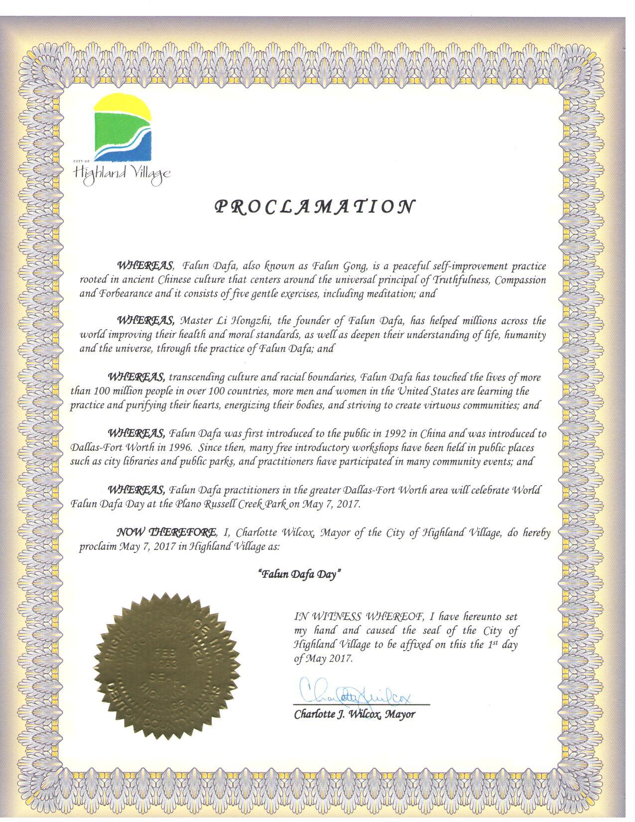 圖7:美國德州海蘭村市宣布「法輪大法日」 |