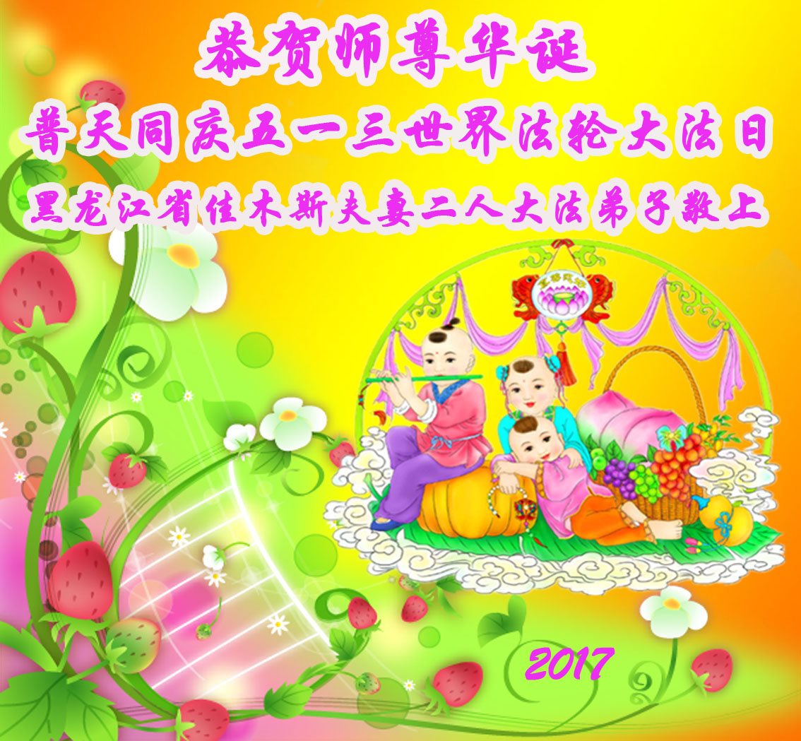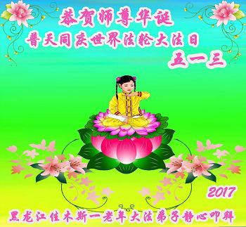 黑龍江省佳木斯一老年大法弟子恭賀世界法輪大法日!