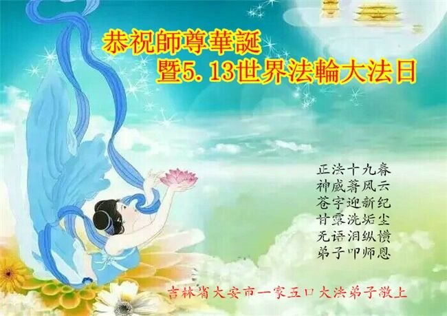 在這萬眾歡騰、普天同慶世界法輪大法日暨師尊華誕,我們全家熱烈慶賀世界法輪大法日!恭祝慈悲偉大的師尊生日快樂!謝謝師父的慈悲苦度!法輪大法好!