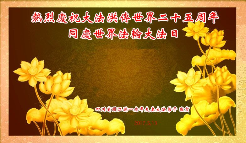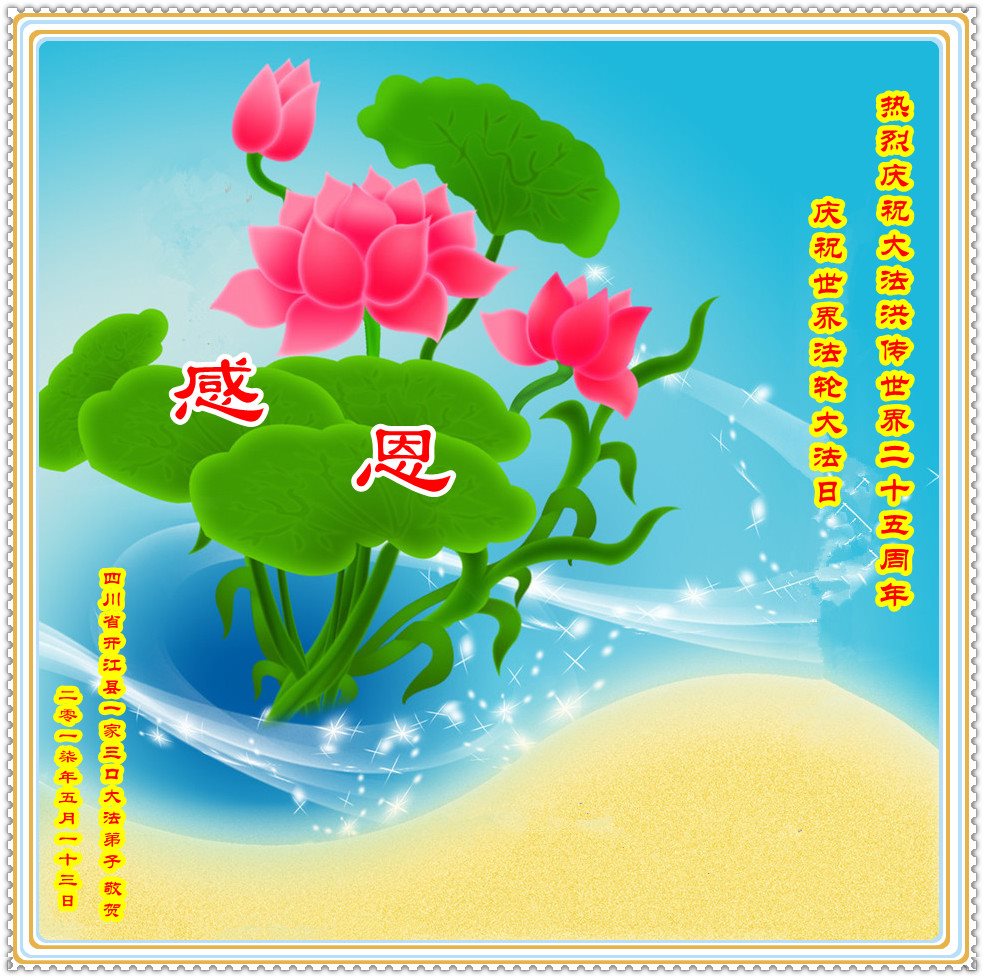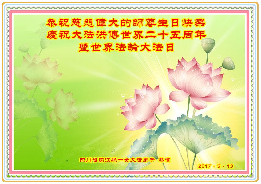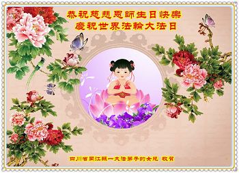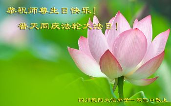 在第十八屆世界法輪大法日暨法輪大法洪傳二十五週年紀念日來臨之時,四川綿陽兩個學法小組三位大法弟子恭祝慈悲偉大的師尊生日快樂!恭祝世界法輪大法日!經過嚴酷的迫害,走過嚴寒的冬天,弟子們沒有動搖對大法的堅定信念,感恩偉大師尊的洪大慈悲!雖然摔過跟頭,在師尊慈悲的救度下,弟子們爬起來了,穩健的走在神的路上。在師尊用巨大的承受換來的珍貴的時間裏,弟子們一定會做好三件事,一思一念同化真善忍,修好自己,用智慧和慈悲儘量多的救度可貴的世人。