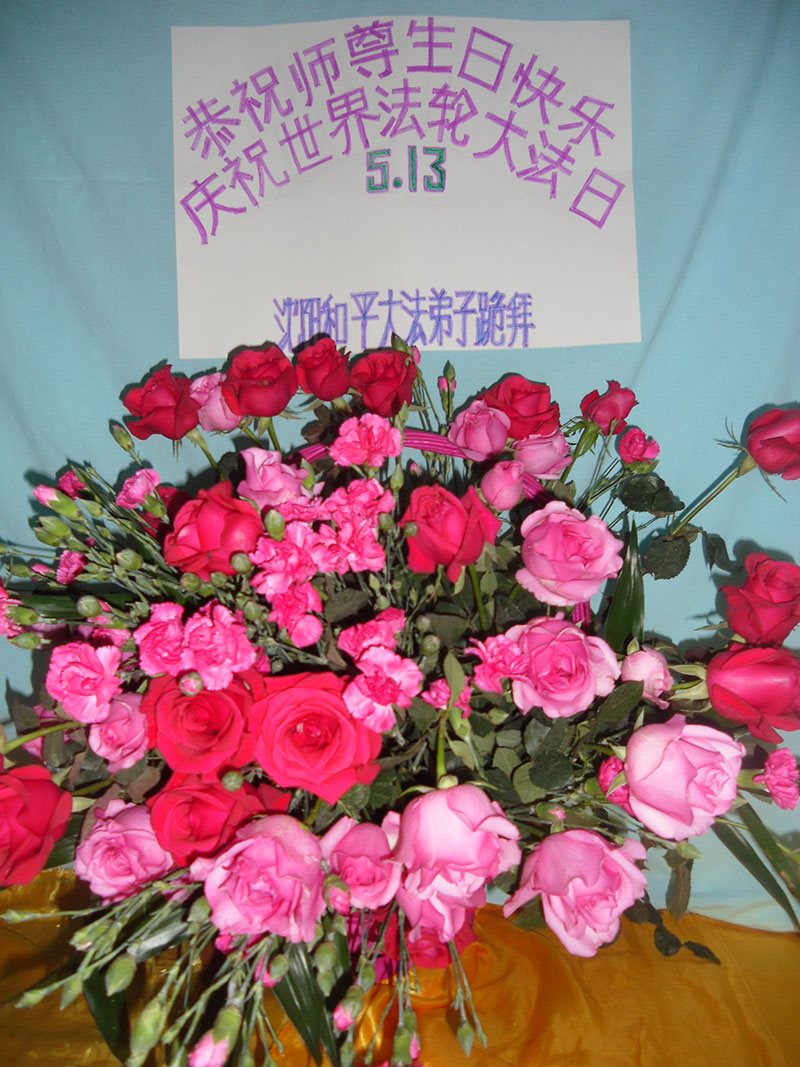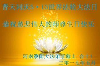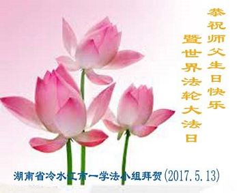 在2017年5月13日,世界法輪大法日暨偉大慈悲的師尊華誕到來之際,我們瀋陽市和平區大法弟子向師父問好!我們一定抓緊時間,精進實修,做好三件事,讓師父高興!感恩師尊慈悲救度!跪拜師尊!