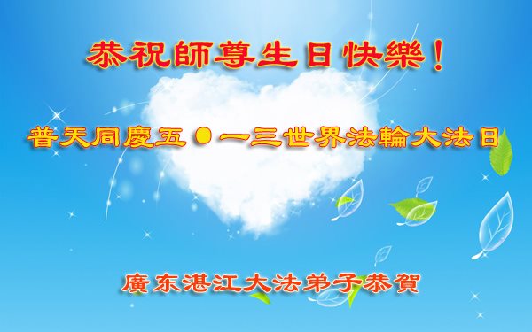 師父,您好!在普天同慶五一三世界法輪大法日的喜慶時刻,湛江大法弟子感謝偉大師尊的慈悲救度!師父您辛苦了!我們一定堅定的走好以後的路,做好三件事,多救人,讓師父多一份欣慰,少一份操勞。弟子叩拜師恩!