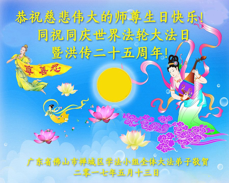 廣東省佛山市禪城區學法小組全體大法弟子恭祝慈悲偉大的師尊生日快樂!同祝同慶世界法輪大法日暨洪傳二十五週年!