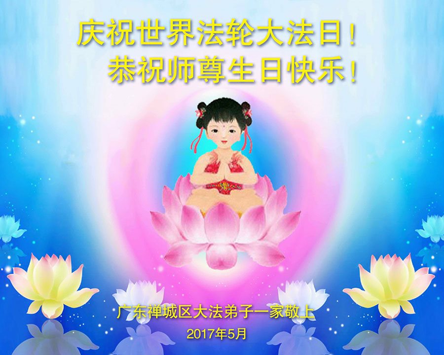 廣東省佛山市禪城區大法弟子一家慶祝世界法輪大法日!恭祝師尊生日快樂!