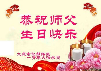 黑龍江省大慶市讓胡路區一青年大法學員恭祝師尊生日快樂!