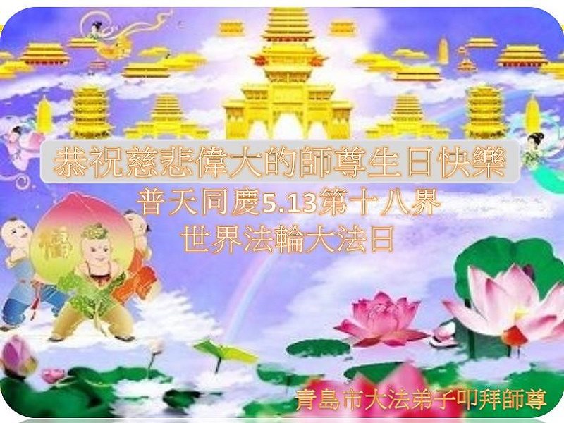 山東省青島大法弟子恭祝師尊華誕世界法輪大法日!