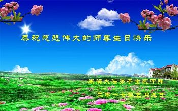 山東省煙台市福山區一大法弟子及家人恭祝師尊生日快樂!