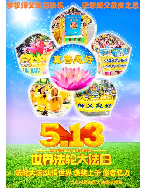 懷著對師父、對大法無以言表的感恩之心、崇敬之心,迎接513普天同慶的幸福時刻!在這個殊勝的日子裏,弟子感慨萬千,感謝師父的慈悲與呵護!使弟子能夠走過修煉的歷程。感謝師父用巨大的付出為我們延續來到時間!弟子唯有精進實修,珍惜寶貴的時間,抓緊做好三件事,修煉如初,完成史前大願。不辜負師父的慈悲苦度,讓師父有更多的欣慰,圓滿隨師還。並獻詞一首: