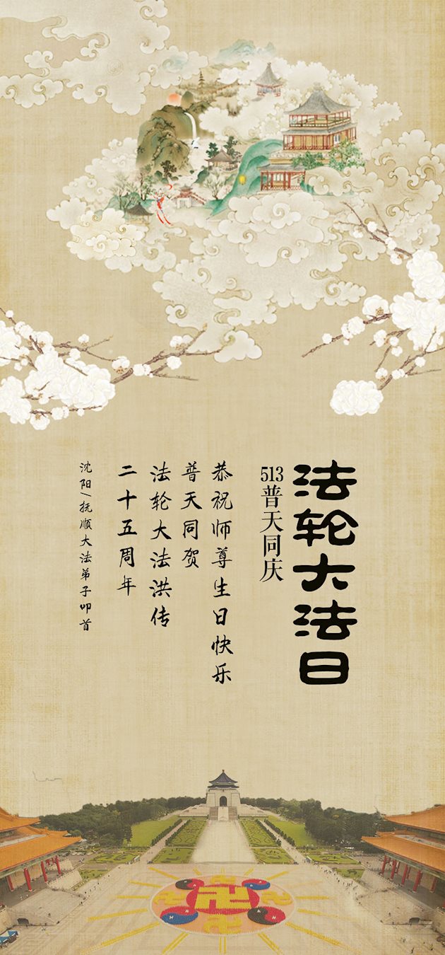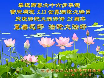 遼寧瀋陽鐵西以及撫順一家大法弟子恭賀法輪大法日,祝慈悲偉大的師父生日快樂!