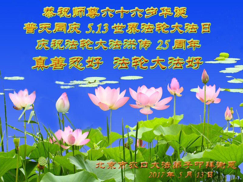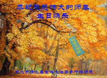 遼寧省撫順市一大法弟子祝師父生日快樂!祝賀世界法輪大法日!一年過去了,又到師父的生日了。師父辛苦了,您又為天地間眾生承受了一年的苦難啊!弟子想您,只能在您的法像前俯首叩拜。弟子謹遵師命,努力做好三件事,做一個合格的正法時期大法弟子。