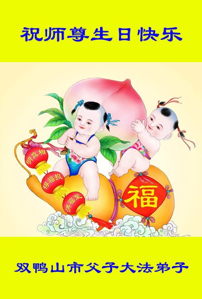 黑龍江雙鴨山市父子大法弟子恭祝慈悲偉大師尊生日快樂!暨慶賀世界法輪大法日!