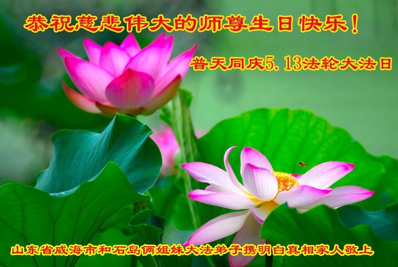 山東省威海市和石島兩姐妹大法弟子攜明白真相家人共同恭祝慈悲偉大的師尊生日快樂!普天同慶5.13世界法輪大法日!