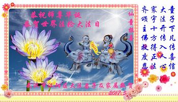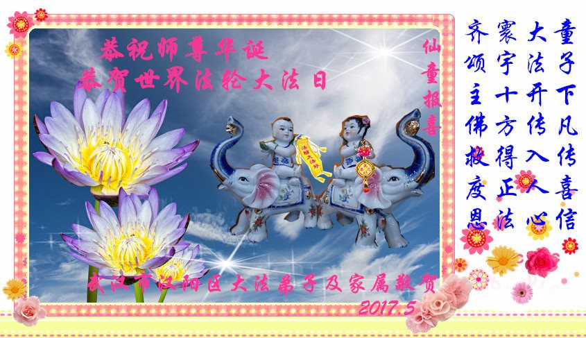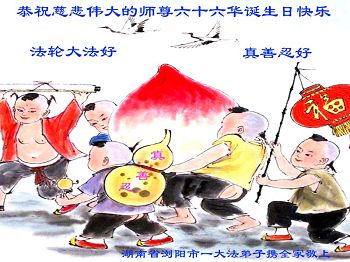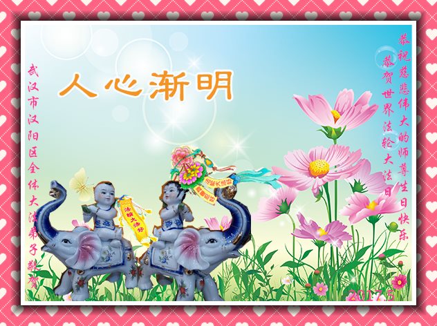 我們是武漢大法弟子一家兩口,恭祝您生日快樂!恭祝法輪大法日!感恩師父的苦度!有師父,有大法,宇宙才有救,眾生才有救,大法弟子才能修圓滿。我還修的不好,還有安逸之心,還有妒嫉心,還有名利之心。不過我特別重視這些東西,哪怕非常微妙,我也要把它挖出來,解體它。我的三件事還的抓緊,堅持抓緊!