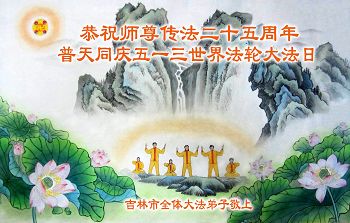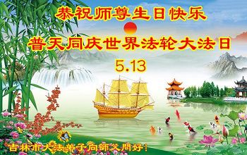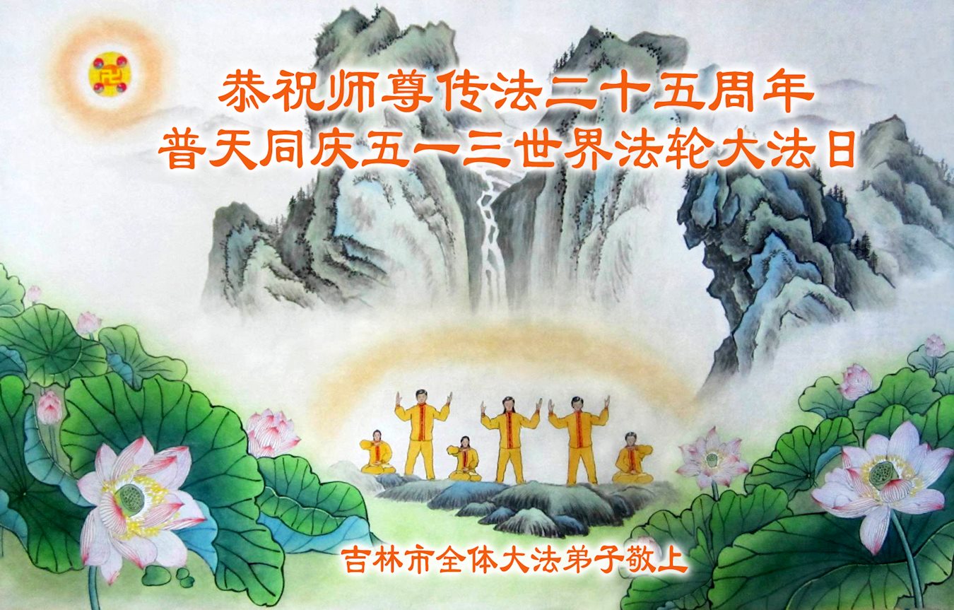 在偉大的師尊傳法二十五週年之際,吉林市全體大法弟子恭祝師尊生日快樂!普天同慶五一三世界法輪大法日!