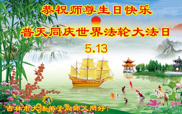 吉林市大法弟子恭祝師尊生日快樂!普天同慶世界法輪大法日!