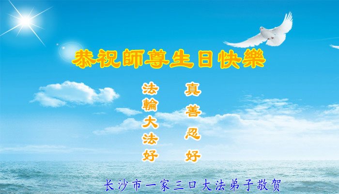 湖南省長沙市一家三口大法弟子恭祝慈悲偉大的師尊生日快樂!