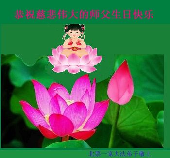 慈悲偉大的師尊:弟子攜全家恭祝您生日快樂!感恩師尊您為度弟子的慈悲付出與承受,弟子讓您操了無數的心,師尊從沒嫌棄弟子,時時點悟提醒弟子要精進做好三件事,並無私的保祐倆個孩子聽話懂事、家庭和睦。