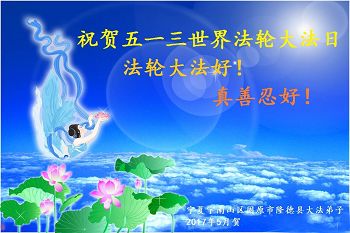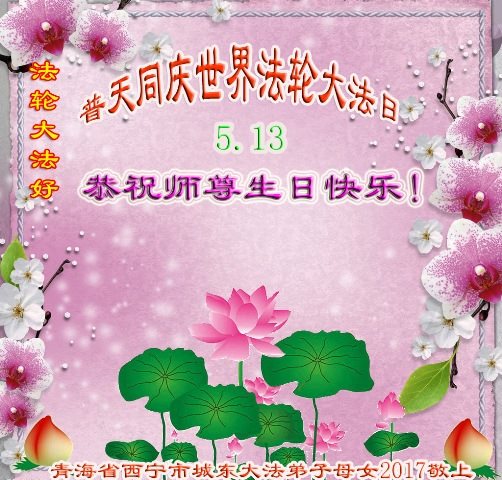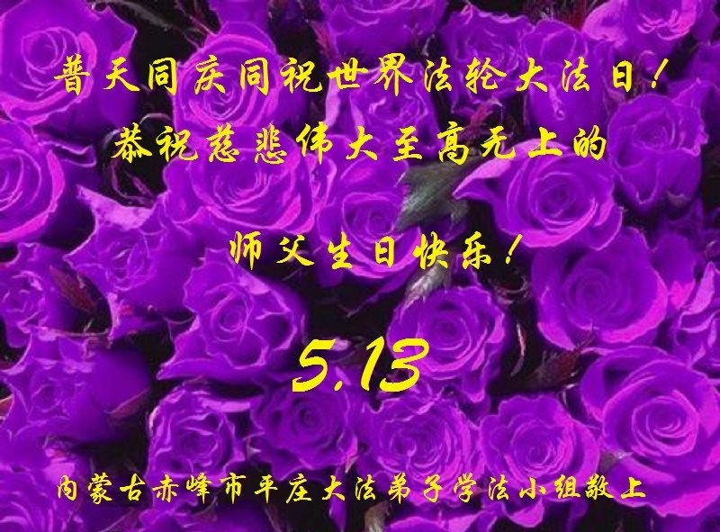 在5.13到來之際,我和家人同修及不修煉的家人恭祝師尊生日快樂!祝賀世界法輪大法日!弟子一定按師父要求的去做,時時刻刻修好自己,向內找,做好三件事,救度更多有緣人,緊跟師尊正法進程,請師父放心。合十!