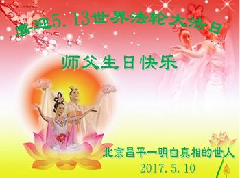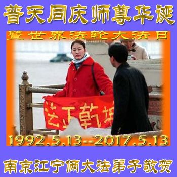 今天,在這普天同慶師尊六十六華誕暨法輪大法傳世二十五週年的日子裏,在師尊正法已接近尾聲的時候,我們南京江寧倆人實修小組大法弟子憶往昔,添正念,抱著捍衛宇宙大法和助師救眾生的決心,一定要越最後越精進,聽師父的話,修好自己,多救眾生,跟師父回家。