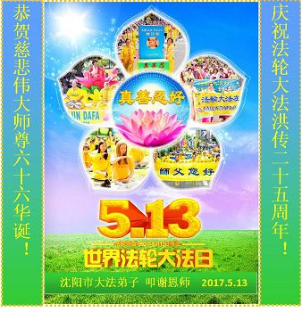 遼寧省瀋陽大法弟子慶賀世界法輪大法日!恭祝師尊生日快樂!