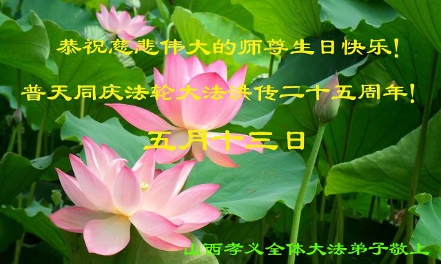 山西省呂梁地區孝義市全體大法弟子恭祝慈悲偉大的師尊生日快樂!普天同慶法輪大法洪傳二十五週年!