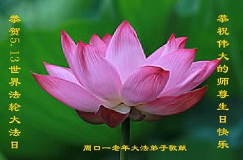 河南省周口一老年大法弟子恭賀法輪大法日!