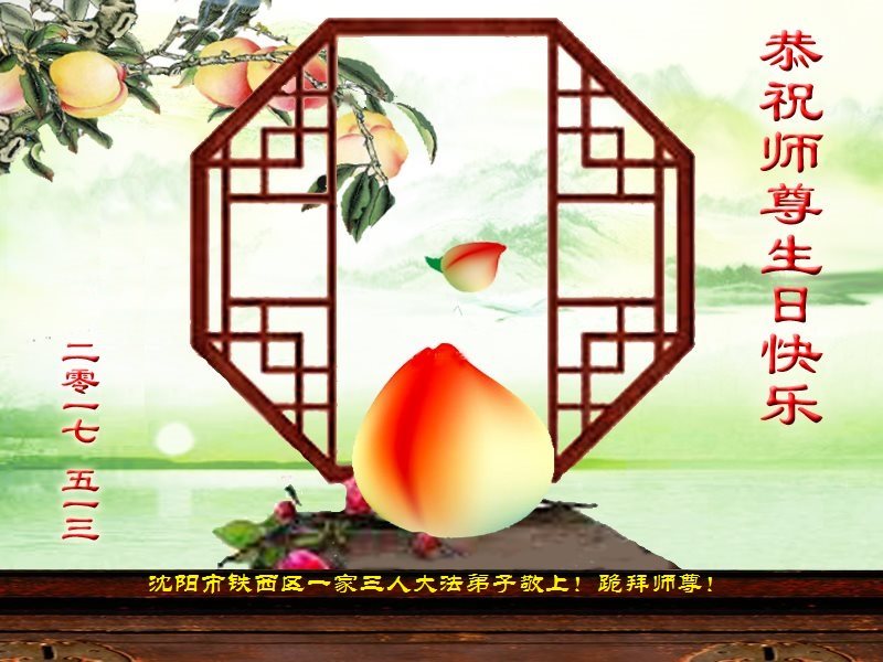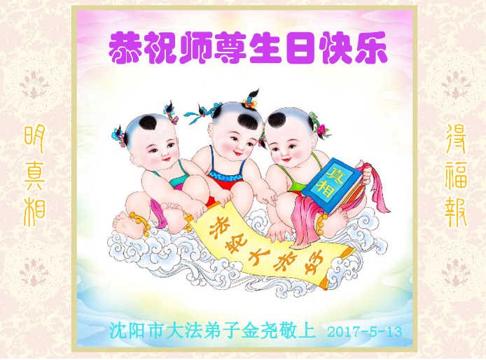 在這普天同慶的日子瀋陽市沈北新區道義全體大法弟子向慈悲偉大的師尊跪拜:感謝師尊慈悲救度之恩,弟子們唯有修好自己的同時,真正的形成整體,做好三件事,多救人,才不辜負師父的慈悲苦度!謝謝師父!
