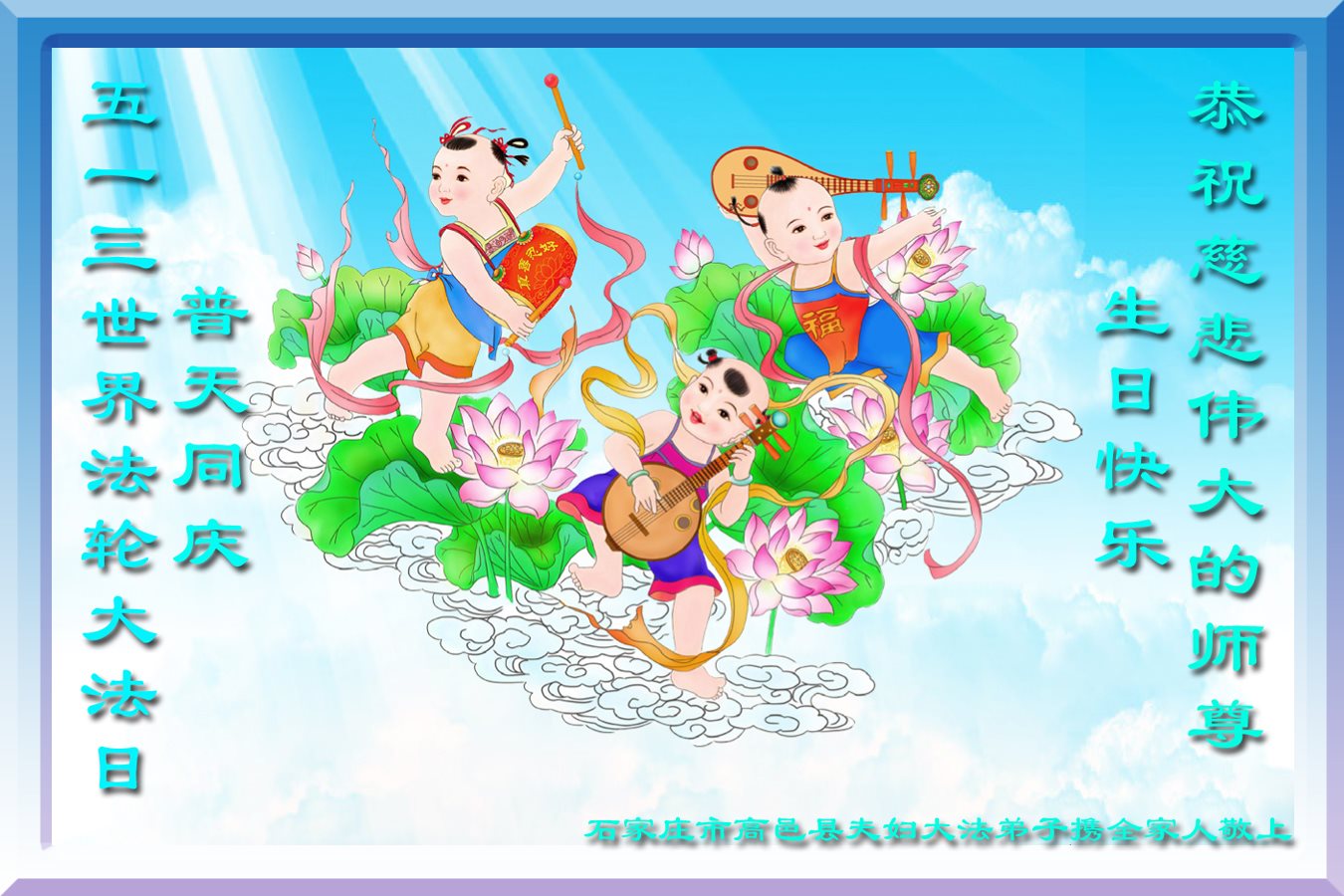 在法輪大法日即將來臨之際,高邑縣夫婦大法弟子攜全家人祝師父生日快樂!普天同慶5.13世界法輪大法日!