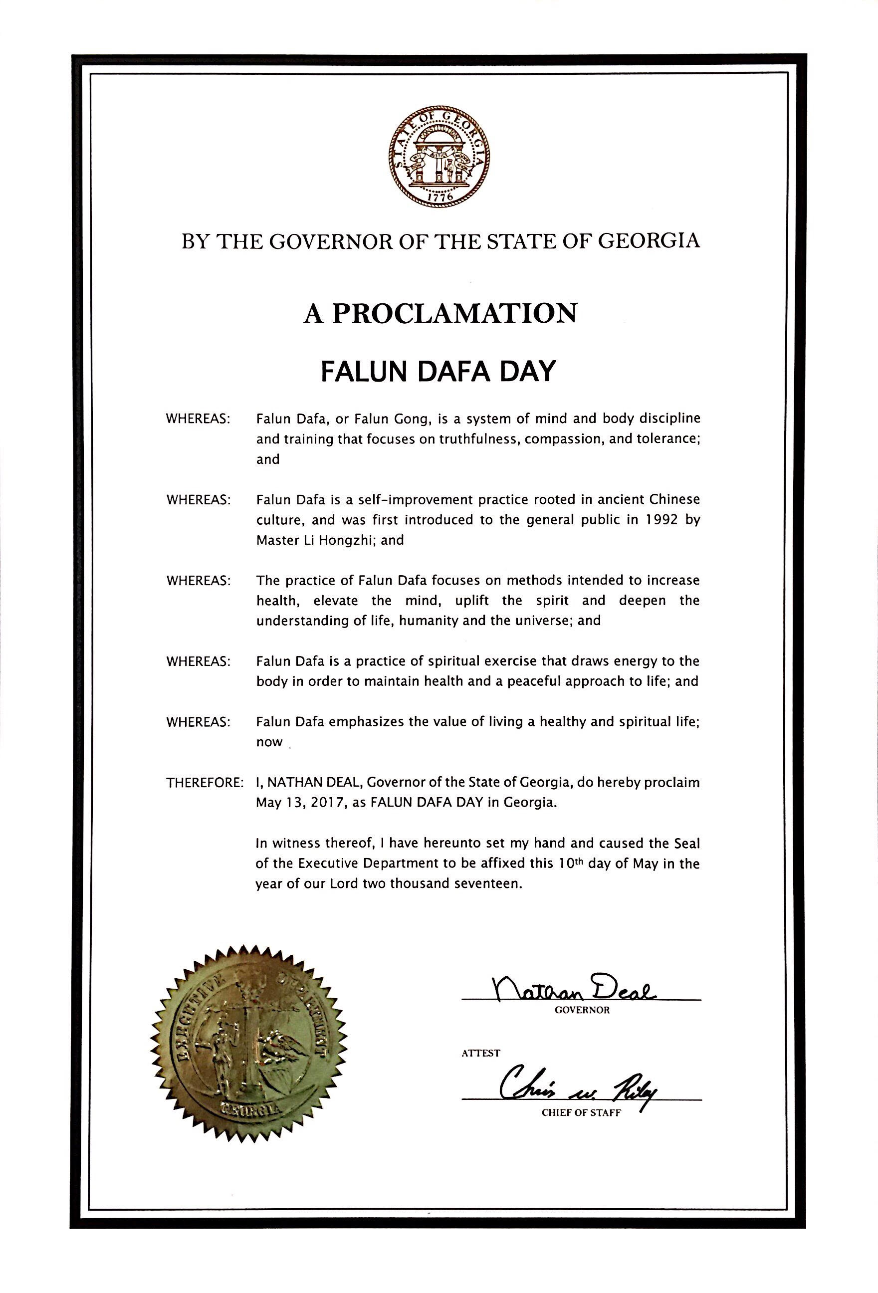 喬治亞州州長內森﹒迪爾(Nathan Deal)在他簽名頒發的褒獎令中說,「法輪大法是根植於真、善、忍特性的身心修煉的法門,是一個基於中國傳統文化的自身修煉方法,1992年由李洪志大師傳出;法輪大法的修煉致力於提升人們的健康、道德、淨化心靈,深入理解生命、人類、和宇宙的意義。因而,我,內森﹒迪爾,宣布2017年5月13日為喬治亞州的法輪大法日。」