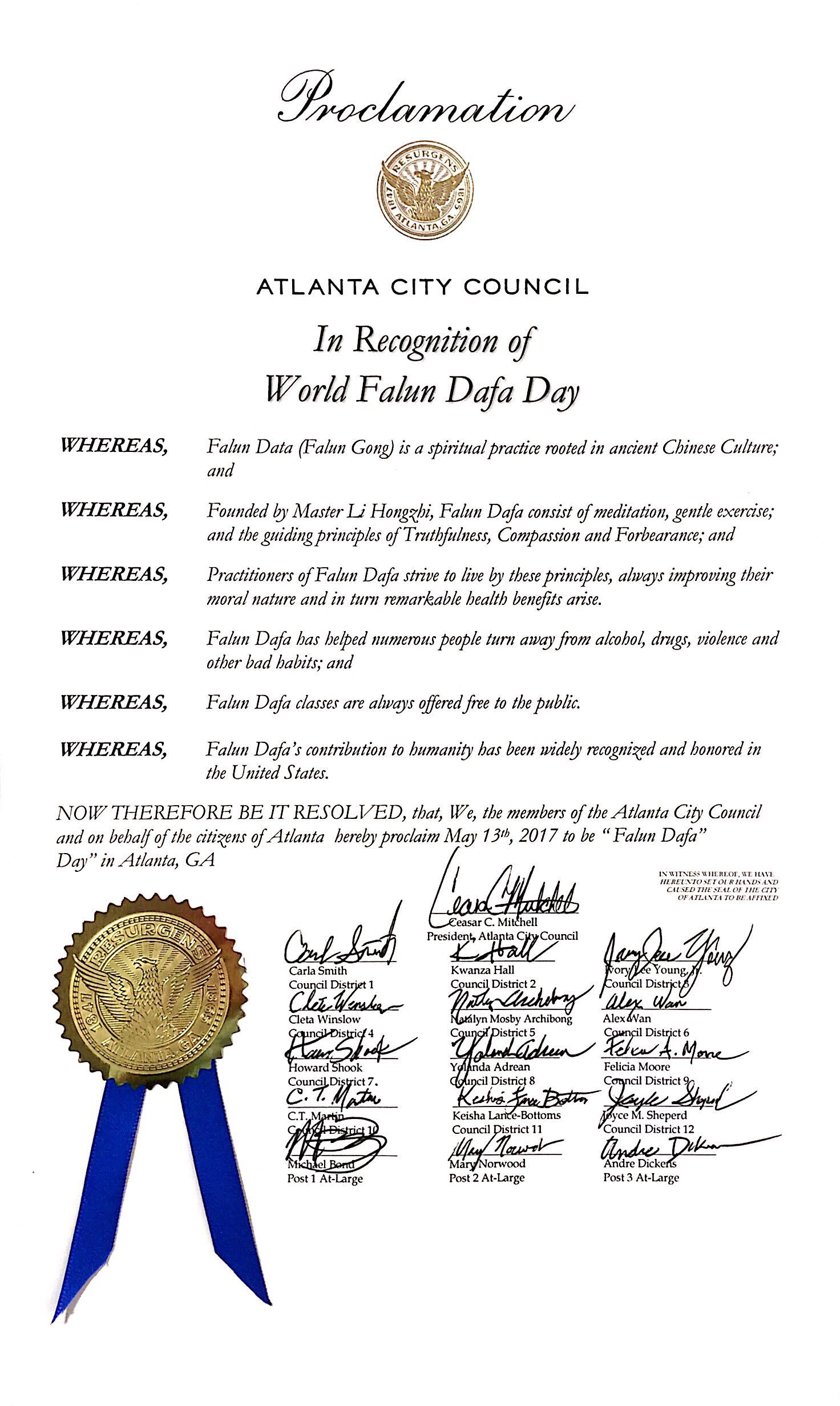 亞特蘭大市議會(Atlanta City Council)的褒獎令由亞特蘭大市議會全體十六名議員共同簽署,褒獎令寫道,「鑑於法輪大法是一個根植於中國傳統文化的氣功修煉法門,自從1992年由李洪志大師奠基,首次面向公眾,法輪功已經使得上千萬人改善健康、淨化身心、提升道德、達到 天人合一的境界;法輪功真、善、忍的理念,五套緩、慢、圓的功法,適宜於各種年齡和背景的人們免費去修煉;因此,喬治亞州亞特蘭大市議會全體議員特此頒發褒獎,表彰法輪大法,並宣布2017年5月13日為:亞特蘭大世界法輪大法日!」