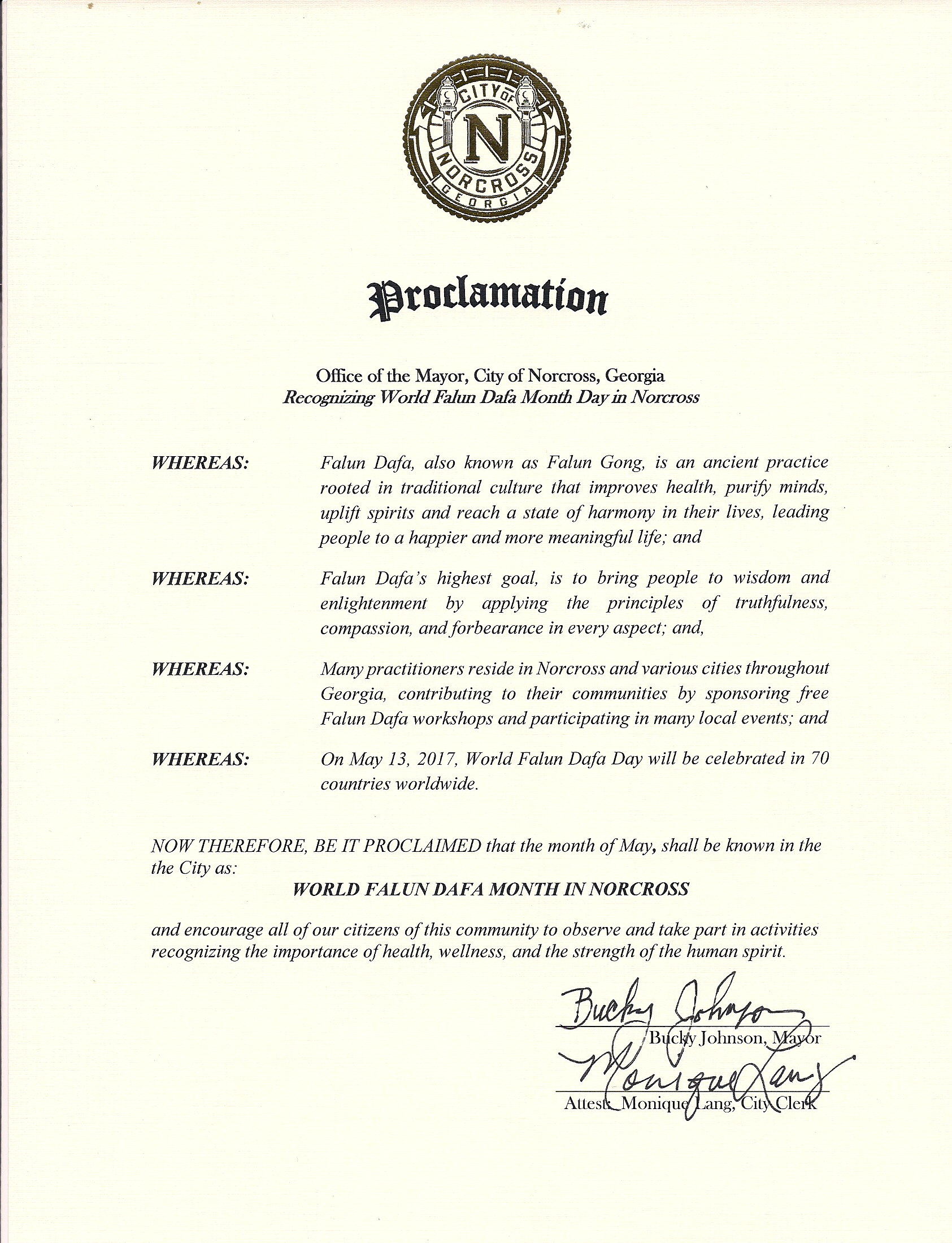 喬治亞州Norcross市市長Bucky Johnson在褒獎令中說,「法輪大法,又稱法輪功,是一個根植於古代修煉傳統的、對人們的健康、心靈都有改善力量的修煉法門,使得人們提升道德,人生更有意義。法輪大法的最高目標,是用真、善、忍的法理使人們可以最後開功開悟,修煉圓滿。在喬治亞州各地,有許多修煉人,他們舉辦免費的教功活動。今年5月13日,世界法輪大法日的慶祝活動將於世界上70多個國家舉行。因此,我宣布2017年5月是Norcross市的法輪大法月!」