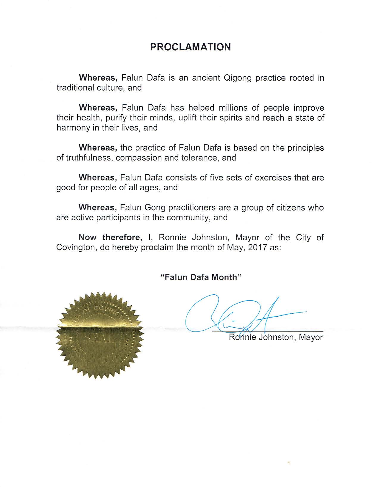 喬治亞州Covington市市長Ronnie Johnston在 褒獎令中說,「法輪大法是根植於傳統文化的古老氣功修煉,法輪大法已經幫助了世界上幾百萬人增進了健康、淨化了心靈,提升了他們的精神境界。法輪功有五套功法,老少咸宜,法輪功學員也是社區積極參與的人群。所以,我僅宣布2017年5月是Covington市的『法輪大法月』!」