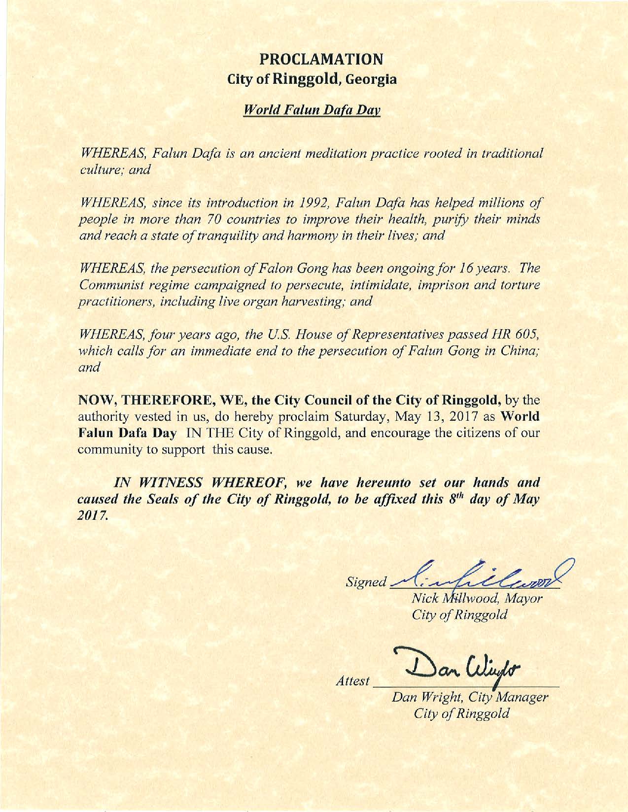 喬治亞州Ringgold市市長Nick Millwood在褒獎令中說,「作為根植於中華傳統文化的法輪大法修煉,從1992年傳世以來,已經讓70多個國家的數以百萬計的人們得到了身、心、靈的健康 和生命的和諧。但中共對法輪功的迫害已經持續18年了,中共政權在迫害、恐嚇、囚禁、和酷刑折磨法輪功學員並活體摘取器官。四年前,美國國會605議案呼籲中國立即停止迫害法輪功。所以,Ringgold市市長及市議會,宣布2017年5月13日為Ringgold市的法輪大法日。」