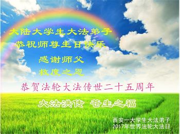 陝西省西安一大學生大法弟子恭賀世界法輪大法日!祝師尊生日快樂!