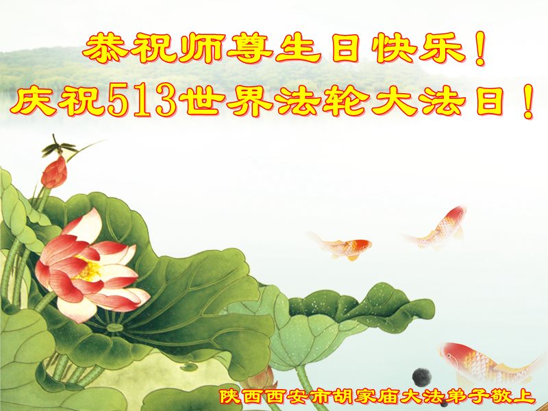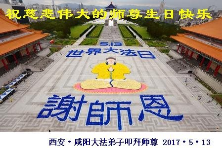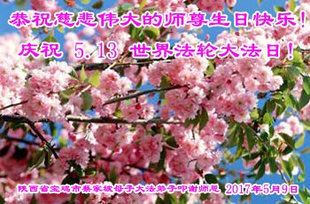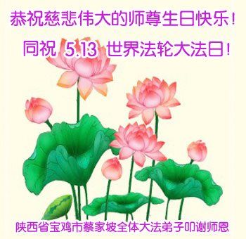 陝西省咸陽大法弟子恭祝慈悲偉大的師父生日快樂!普天同慶五﹒一三世界法輪大法日!