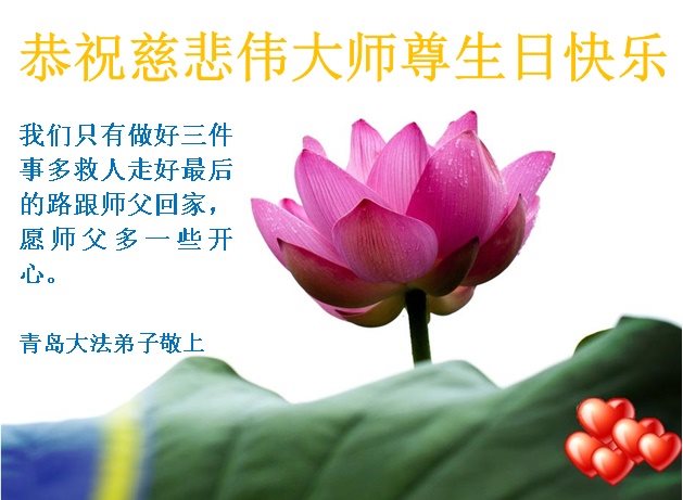 山東省青島全體大法弟子恭祝慈悲偉大的師父生日快樂!