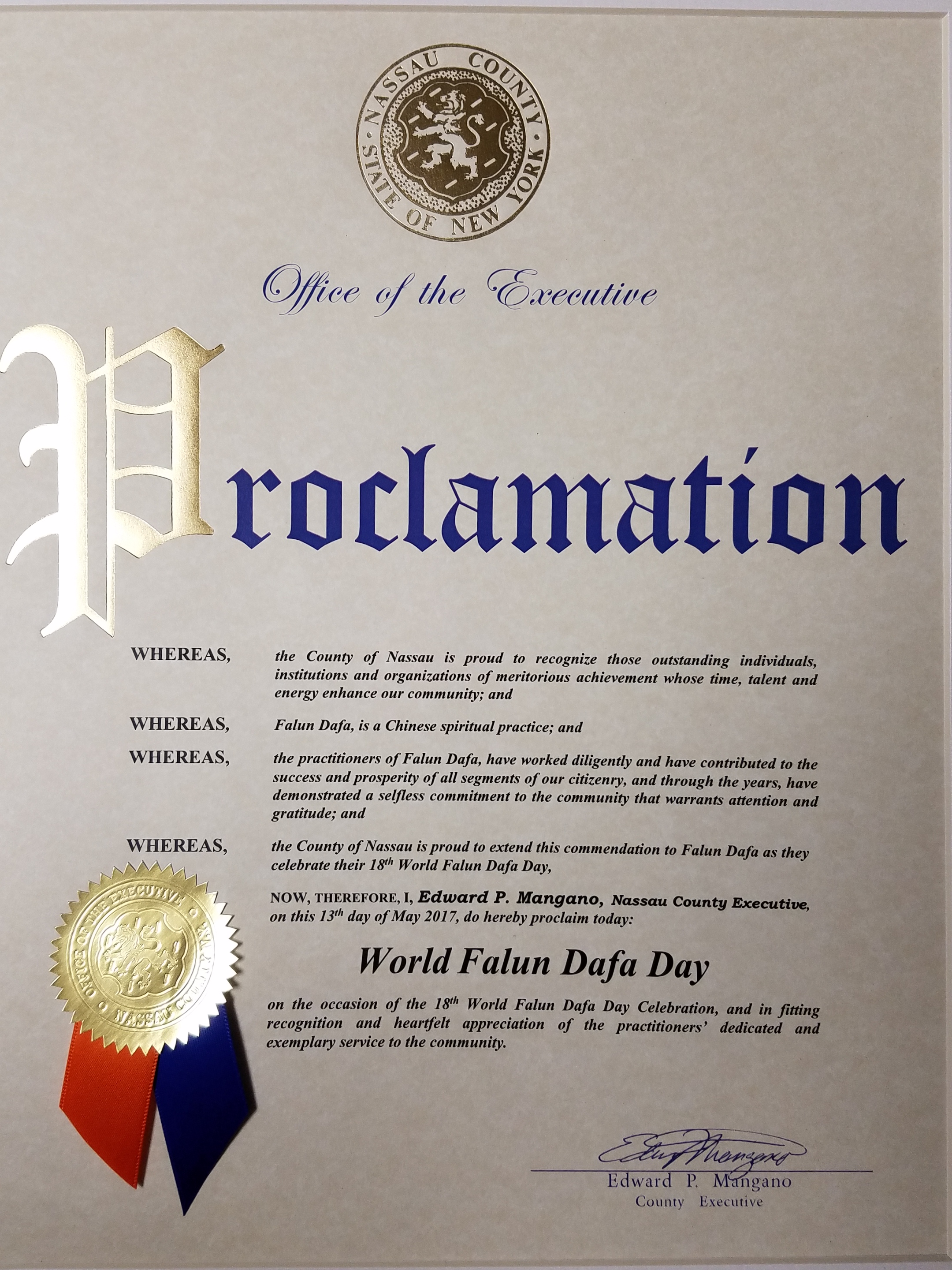 紐約長島拉撒縣(Nassau county executive)執行長愛德華•曼加諾(Edward P. Mangano)頒發褒獎,讚揚法輪大法給人類帶來的福祉,並宣布二零一七年五月十三日為拉撒縣的世界法輪大法日。